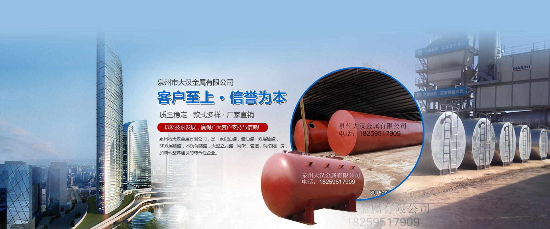 泉州市大漢金屬有限公司,是一家以油罐、儲油罐、雙層油罐、SF雙層油罐、不銹鋼儲罐、大型立式罐、網(wǎng)架、管道、鋼結(jié)構(gòu)廠房、加油站整體建設(shè)的綜合性企業(yè)。本公司以技術(shù)人員、施工經(jīng)驗(yàn)豐富的工程隊、自動化設(shè)備、擁有鋼結(jié)構(gòu)建筑、螺栓球網(wǎng)架設(shè)計安裝技術(shù)力量,嚴(yán)格按照國家容器標(biāo)準(zhǔn)制造,是一家產(chǎn)品開發(fā)并生產(chǎn)各種壓力容器和制造金屬結(jié)構(gòu)工程,化工石油工程安裝的大型企業(yè)。近多年來,以質(zhì)量穩(wěn)定、客戶至上、信譽(yù)為本,以科技求發(fā)展,贏得廣大客戶支持與信賴。